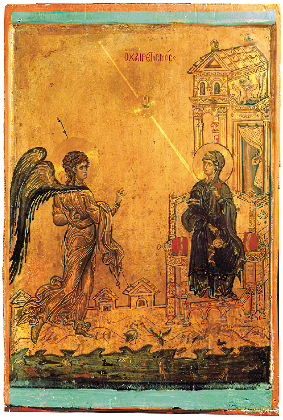 Theologically, the scene emphasizes the Virgin’s active role in salvation history. Unlike some Byzantine representations of the Annunciation, here Mary is depicted as upright and firm, with her frontal pose signaling agency and receptivity. This aligns with the theological texts found in the Miscellany itself, particularly the Homily on the Virgin Mary, which frames Mary not merely as the vessel of Incarnation but as a theologically engaged figure worthy of sustained meditation.